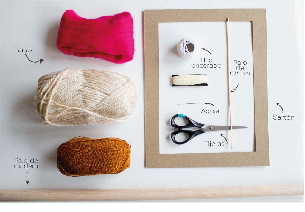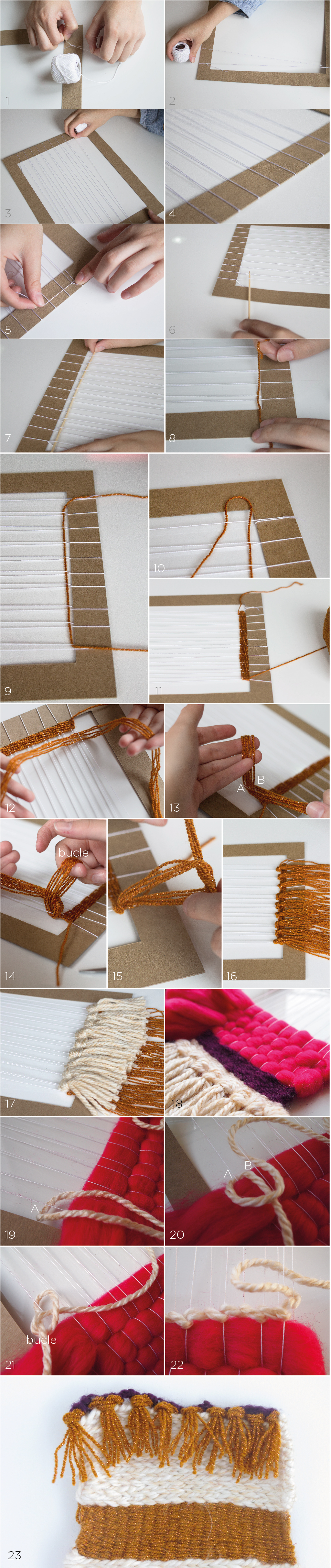 - Amarra el hilo al marco. Lo puedes hacer tú misma con un cartón resistente o con madera. La medida la escoges tú, de eso dependerá el tamaño del tapete.