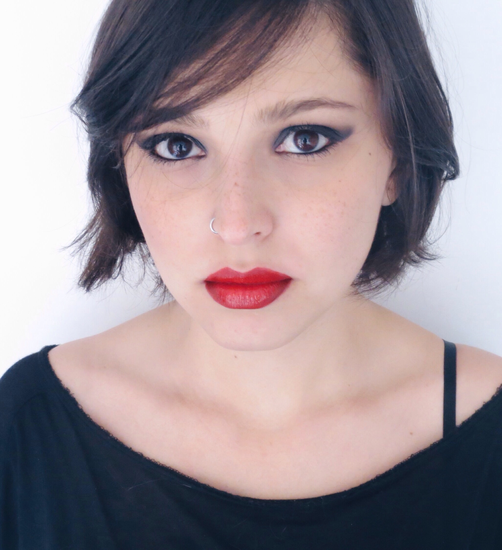- Échate el labial más oscuro en toda la boca y encima del delineador.