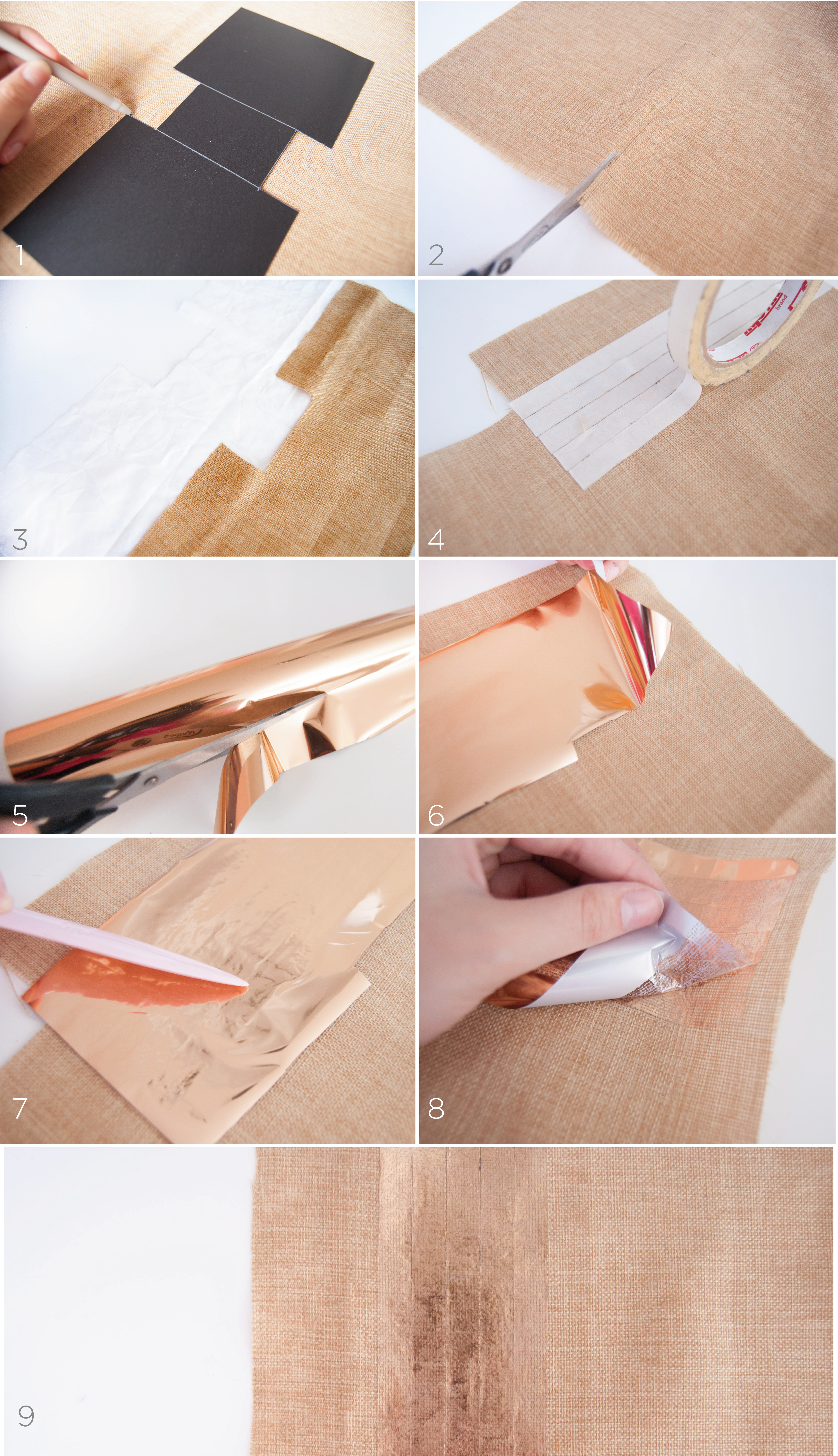 Esta semana quisimos probar el papel foil porque nos parece divino y es una forma fácil y casera de poner una textura metalizada en papel, telas e incluso cerámicas. El primer intento fue sobre dos tipos de tela diferentes; después de varias pruebas y errores, encontré una alternativa. Este post será el primero de muchos DIY usando foil con los que terminaré decorando toda la casa de dorado, cobre y plateado.