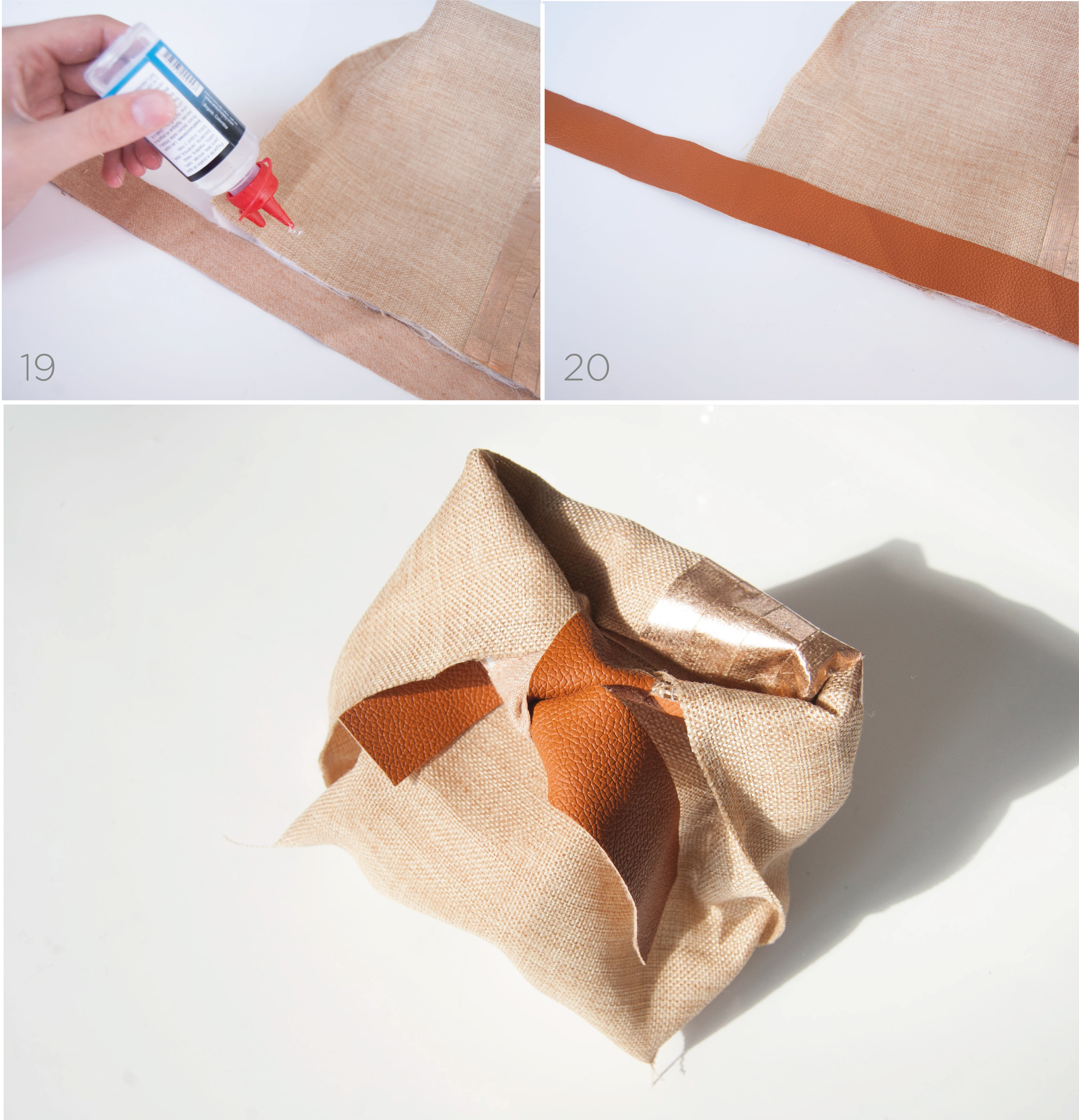 18. Con el pegante de tela, une las dos bolsas en el borde.
