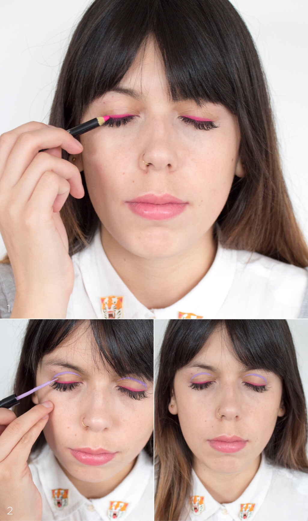 - Primero, escojan dos delineadores de colores que contrasten. Nosotras usamos un tono pastel y otro neón. Con el color más fuerte delineen justo encima de la línea de las pestañas.
