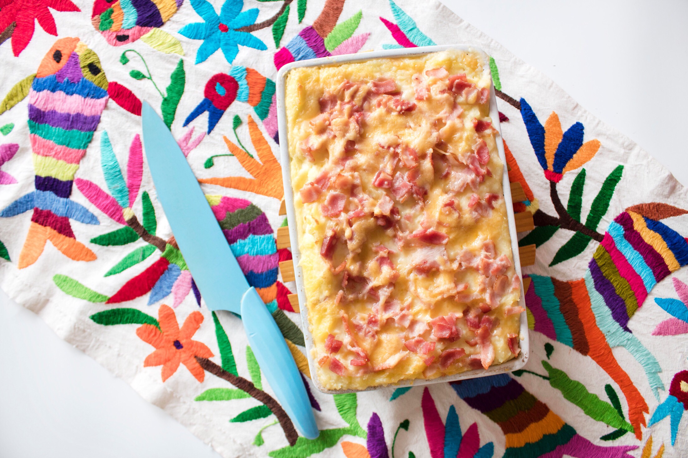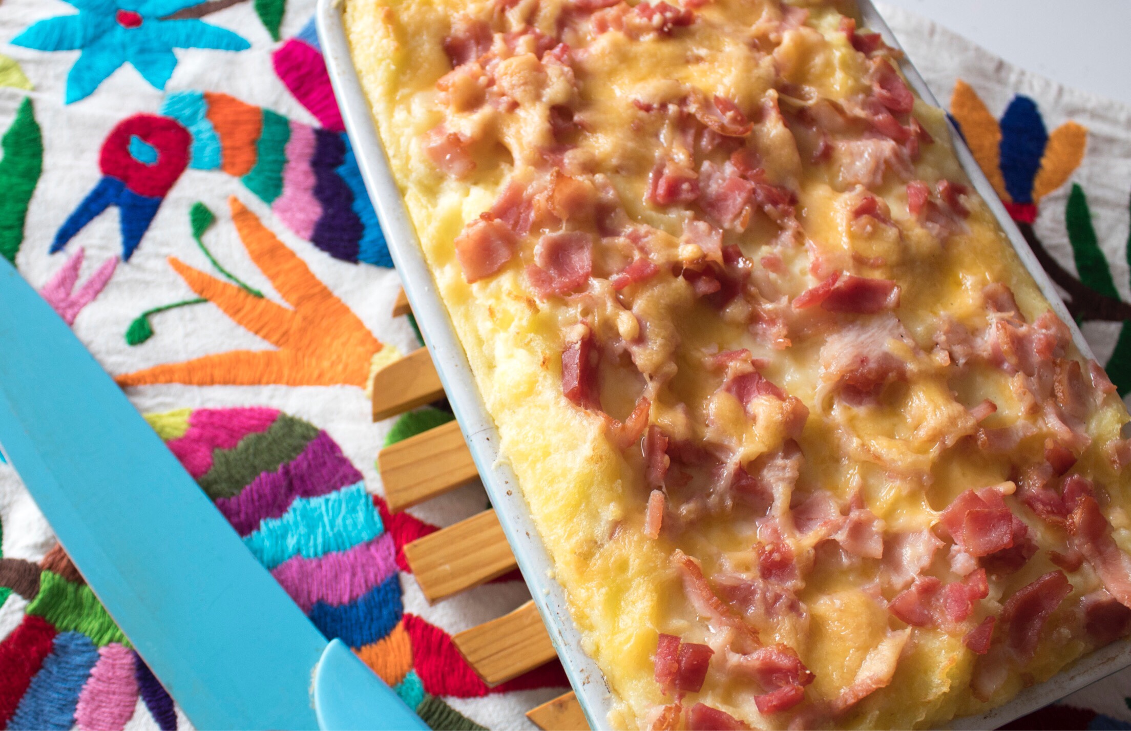 - Mezclen el puré con la salsa de queso y pónganla en una refractaria. Encima del puré pongan trocitos de tocineta y más queso cheddar.