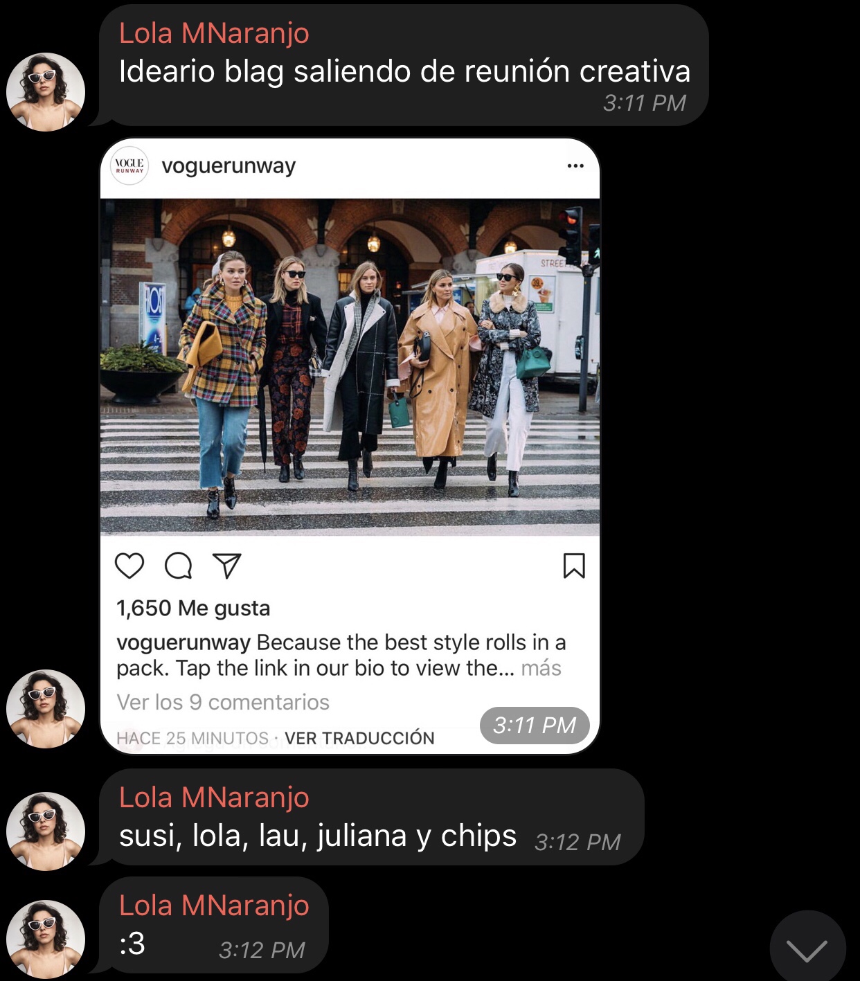 Además de nuestras vidas, Pinterest e Instagram son nuestros mejores amigos; ahí buscamos referentes y seguimos páginas que nos inspiran. Entonces en nuestro chat siempre encontrarán: «Miren esto que vi en Instagram, deberíamos hacer algo así para el post de xx» o «¿Y qué tal si para el post de xy hacemos unas imágenes como estas que vi en Pinterest?».